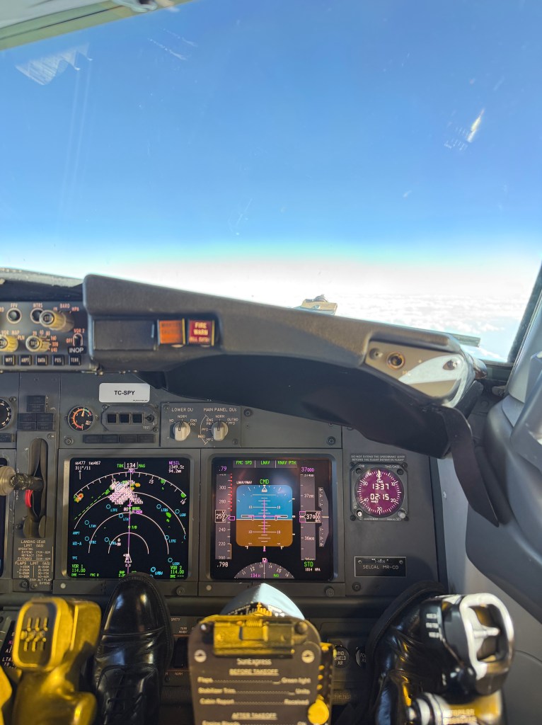 Enfin en l’air, nous discutons des évènements avec le captain, qui est visiblement marqué par le (non) évènement. Je tente de le rassurer, et suis ravi d’être pilote en fonction sur cette branche retour, lui semblant troublé et préoccupé, la tête ailleurs.
