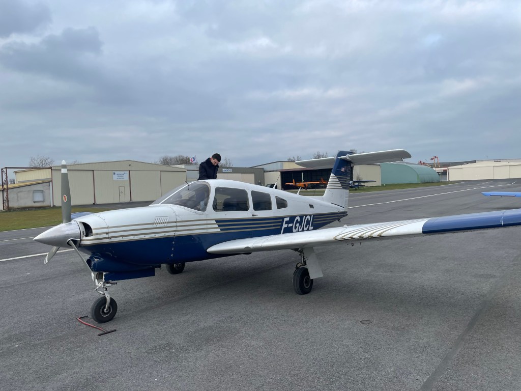 Je vais à l’Aéroclub de Champagne, à Reims, pour passer les variantes VP et RU, soit hélice à pas variable et train rentrant, sur un avion que j’adore, le PA28 Turbo Arrow IV et son empennage en T (j’obtiens en prime les variantes EFIS et turbo, heureuses conséquences de l’équipement et la motorisation de cet avion).